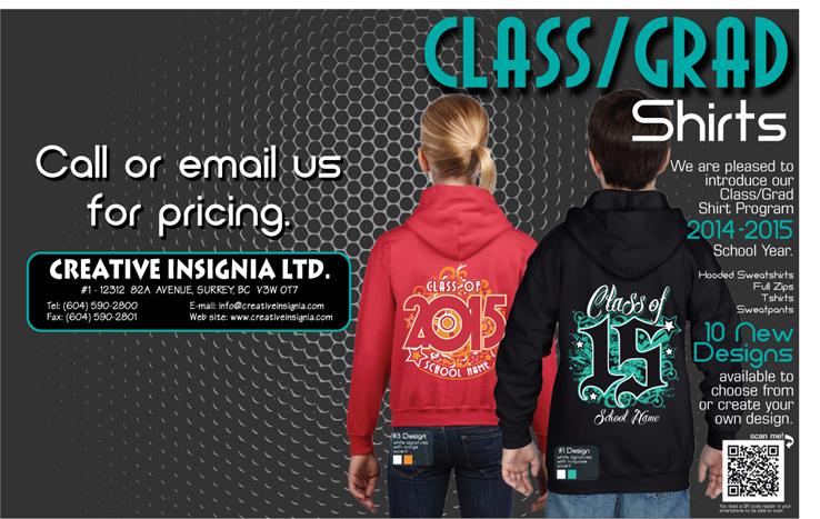 Class / Grad Shirts Program Procedure: Have Class decide the design, shirt colour and print colours. Contact our office & we will forward the selected artwork as well as a complimentary pen for the students to use to sign the design in BLACK. Sizing samples are also available upon request. Return a consolidated order, signed 15 & garment samples. Confirmation of order will be faxed to the school. Student cheques should be payable to the School and we will invoice the School when the completed order is delivered to the School in approx. 3-4 weeks. Please double check order as a request for 1 more shirt after order is complete is very expensive. If you have any questions about our Class/Grad Shirts Program or require information about other products please contact us.